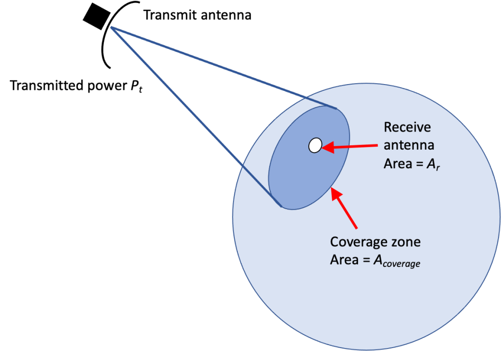 Now if your constraint is to provide reception in a given coverage area such as a country or continent from some orbit, or part of a town from a telephony base station, you may use another formula that simply uses the ratio of receive antenna effective area to coverage area.